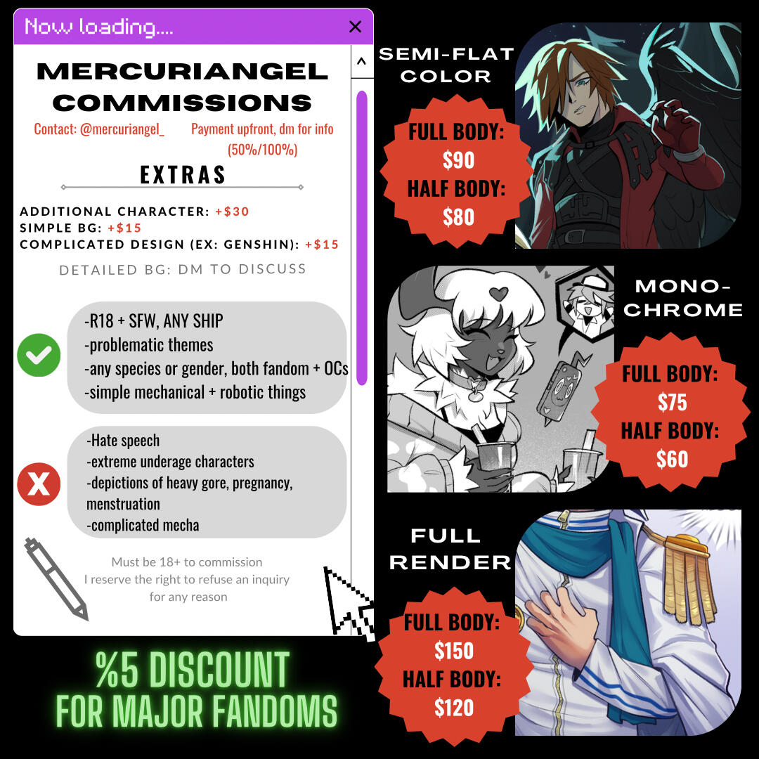 *5% fandom discount applies only to color/monochrome/artistic freedom commissions, NOT sketchit’s applicable for any subject matter/ship that would relevant for engagement with my twitter account audience. This discount only applies for POSTABLE pieces, not private ones (of course, private ones are still available!)