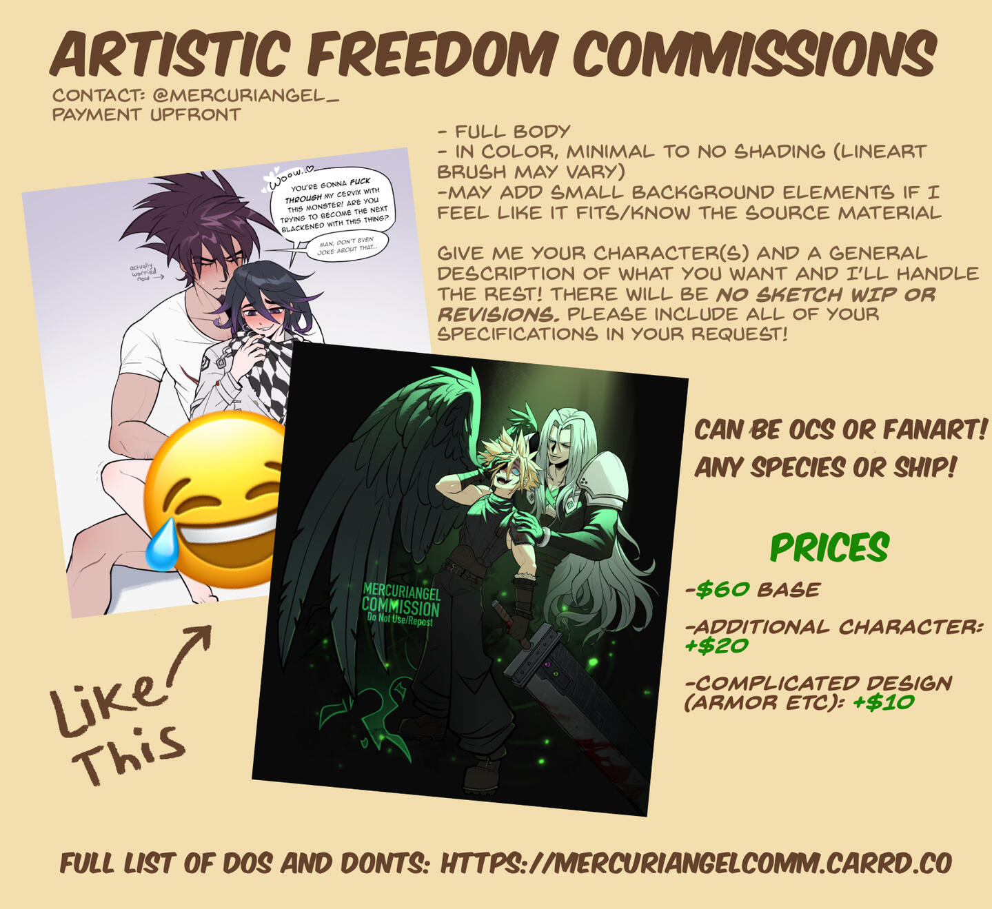 1. I reserve the right to reject a commission for any reason.2. You may not resell artwork or use it commercially unless discussed. You may not alter the artwork without permission. You are free to post it anywhere without credit (though appreciated!), as long as you don't claim you made it yourself. You MAY NOT mint the commissioned work as an NFT under any circumstances, even for art intended for commercial use. You MAY NOT use the image for an artificial intelligence neural network.3. I reserve the right to post the artwork online in a gallery/portfolio etc. I will not further profit from the commissioned work.3. 1st change is free, any after I will charge a $10 fee.PAYMENT